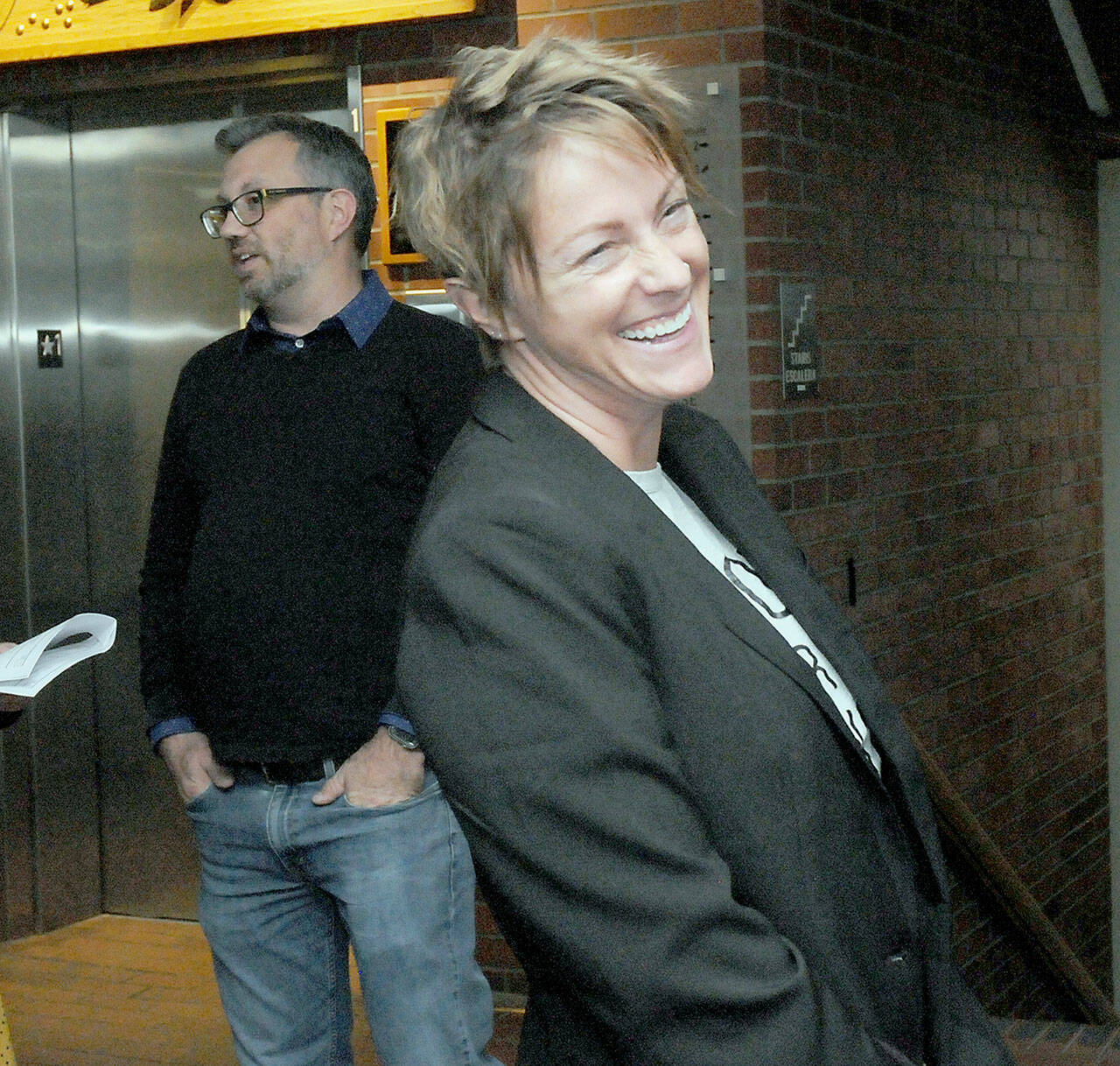 Port of Port Angeles incumbent Connie Beauvais, left, and incumbent Port Angeles City Council member Navarra Carr examine early election returns on Tuesday at the Clallam County Courthouse.