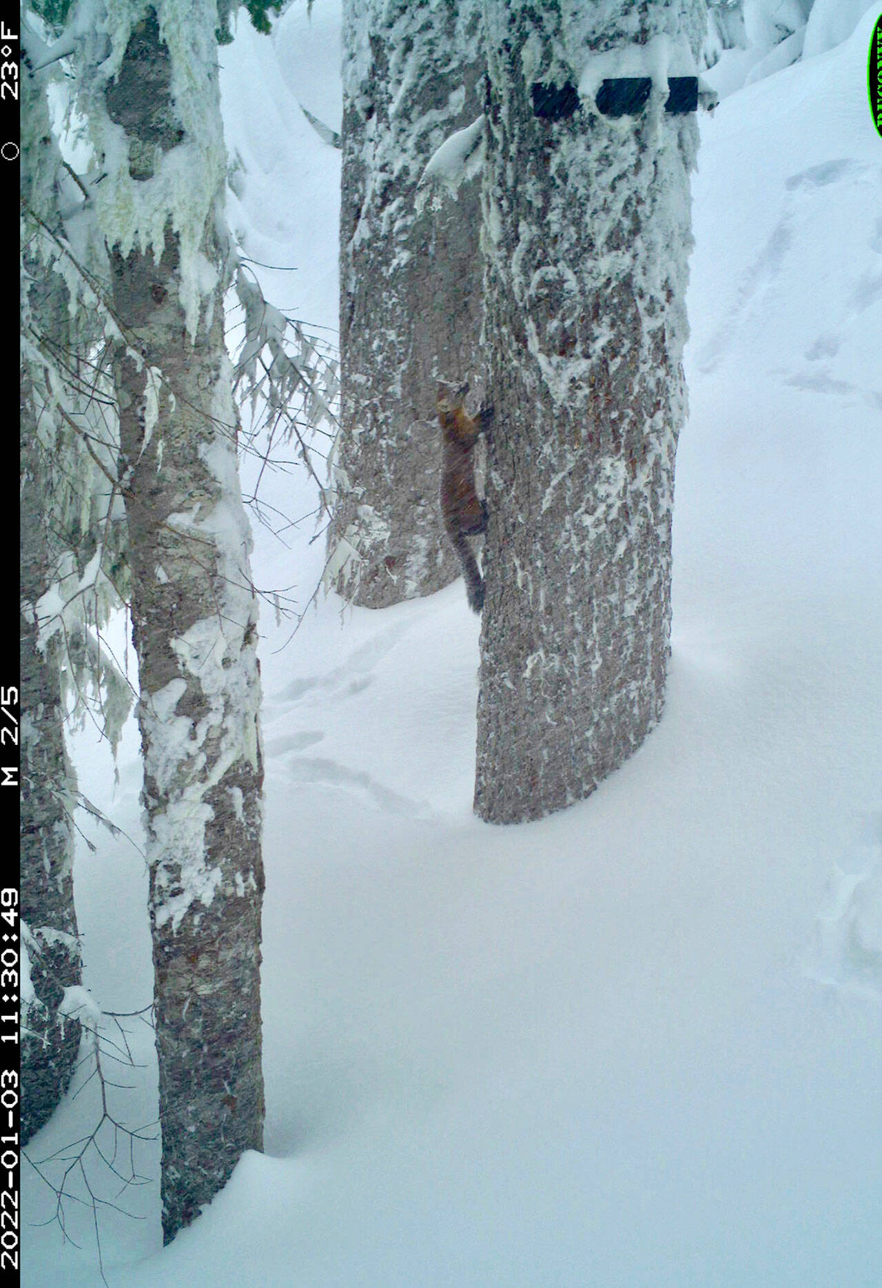 Then, in 2017, Woodland Park Zoo worked with Olympic National Forest, Olympic National Park, and U.S. Geological Survey to conduct overwinter surveys, pairing cameras with scent dispensers programmed to release a small amount of attractive lure on a regular basis.