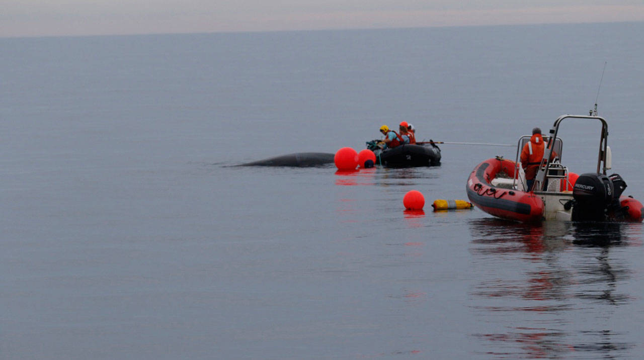 The entangled whale off the tip of the Olympic Peninsula was first reported just before noon last Thursday by Todd’s Extreme Fishing, which stayed with the whale to monitor its location until the Makah Tribe and U.S. Coast Guard arrived to take over the watch.