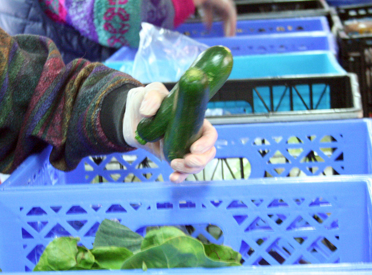 A line formed prior to the 10 a.m. weekly service, and when manager Mike Boock opened the doors at 760 Chimacum Road in Port Hadlock, clients came in a single-file line, started picking out grains and canned goods and advanced to protein and veggies before they reached the baked goods.