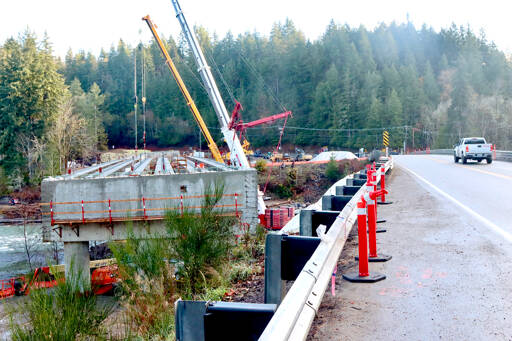 Setting the girders is part of a $36 million project to replace the bridge, which was built in 1926. After the Glines Canyon and Elwha dams were taken down in a project that ended in 2014, the Elwha River changed in course and eroded the bridge foundations, lowering the riverbed by an estimated 14 feet.