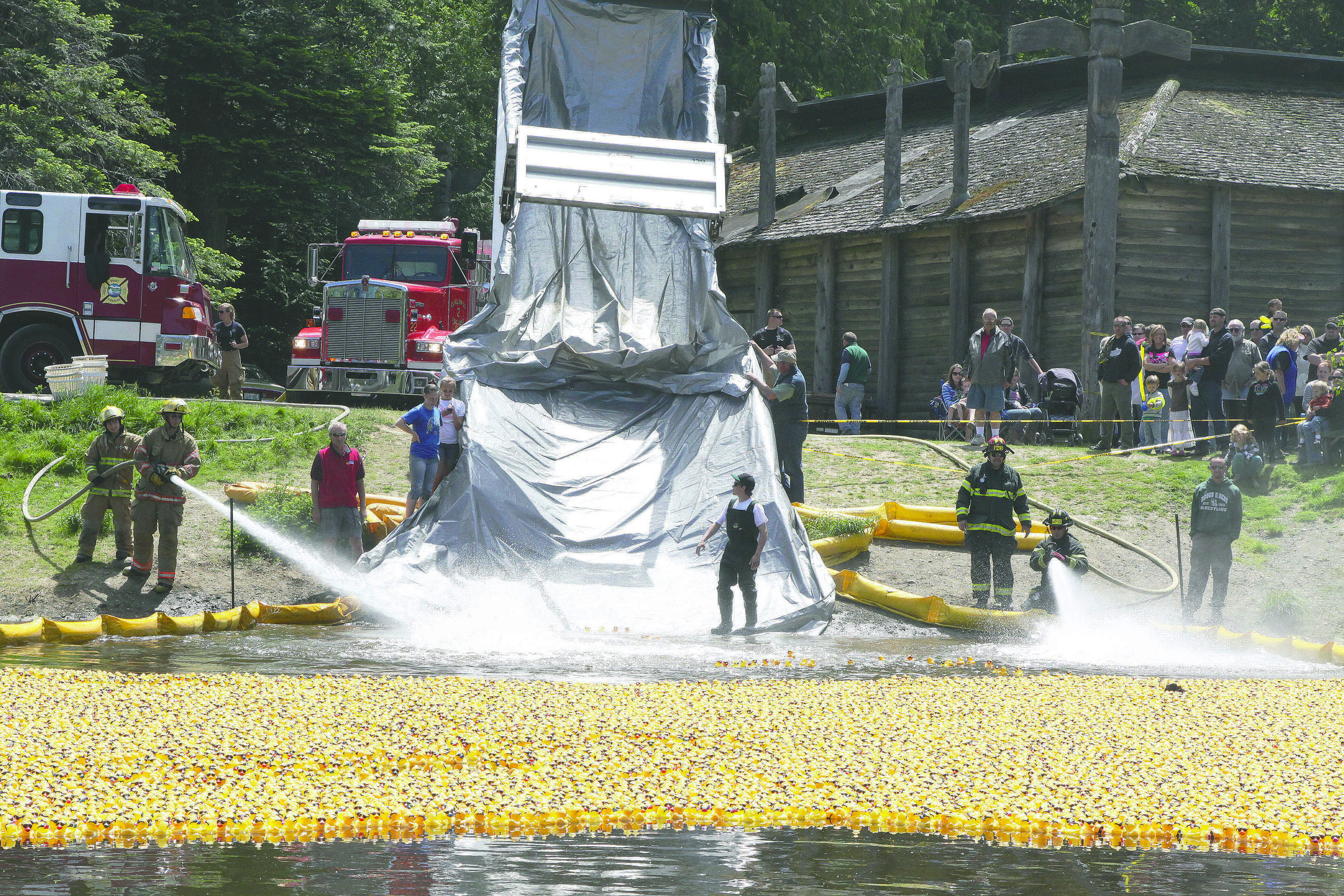 But the real contest in the 2013 Duck Derby was between the Port Angeles Fire Department, which wielded two fire hoses to push the ducks across the pond, and a gusty wind that threatened to push the rubber toys back to the starting line.