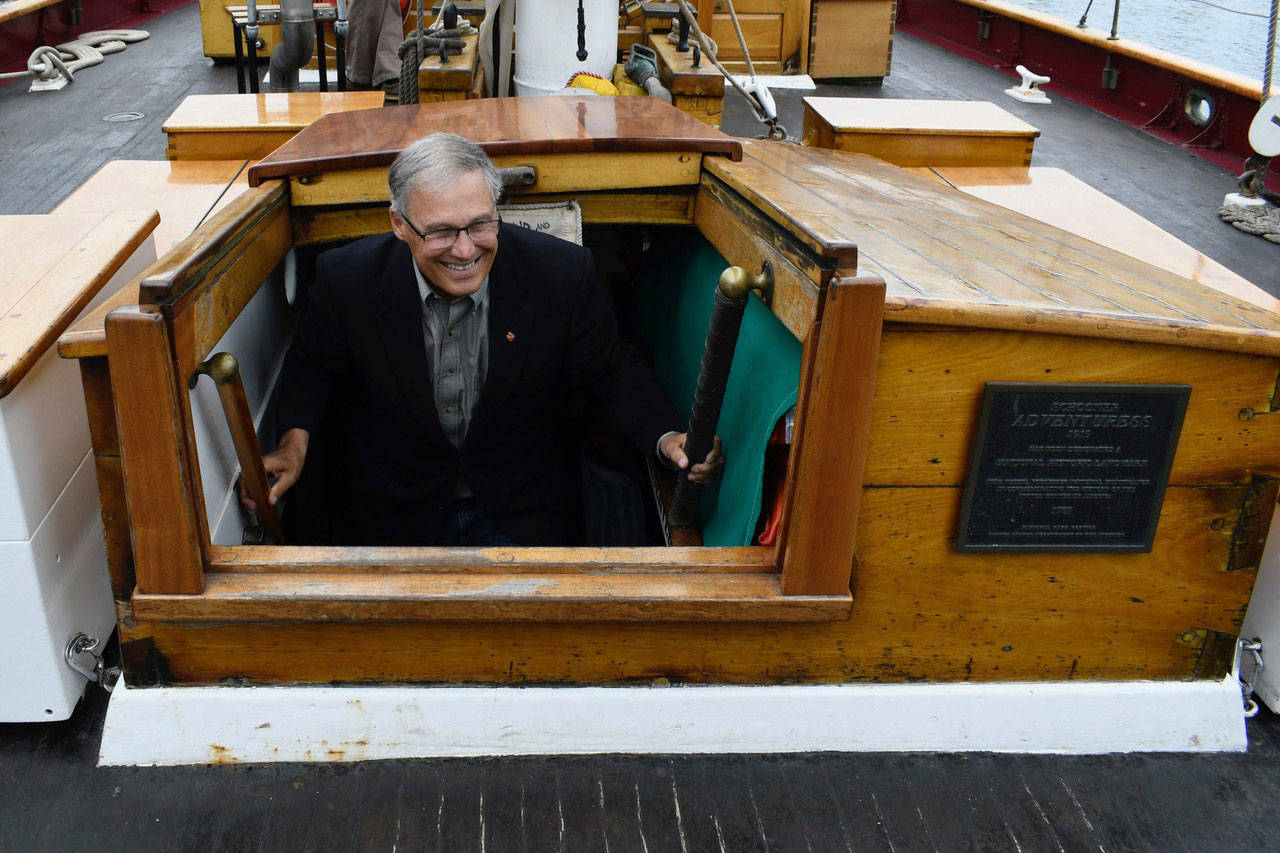 Part of the governor’s itinerary was a visit to the Adventuress, one of two National Historical Landmark sailing ships still sailing West Coast waters. The schooner was declared Puget Sound’s official Environmental Tall Ship in 2016 and makes its home in Port Townsend during the summer months.