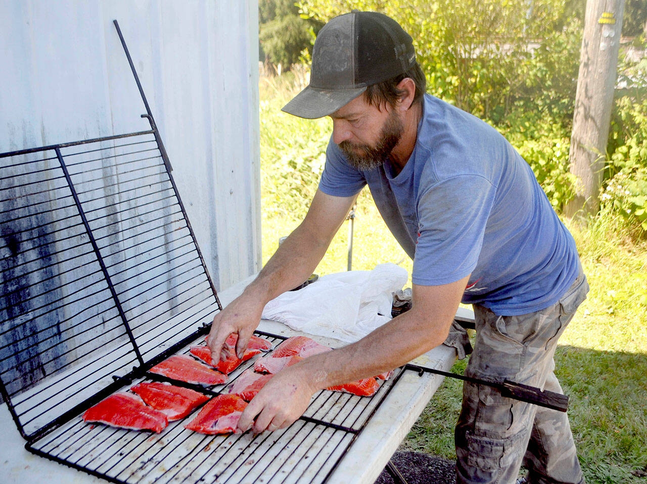 Rick Haartley, president of the Crescent Bay Lions Club, prepares planks of salmon during a benefit salmon feed on Saturday at Joyce Daze. (Keith Thorpe/Peninsula Daily News)
