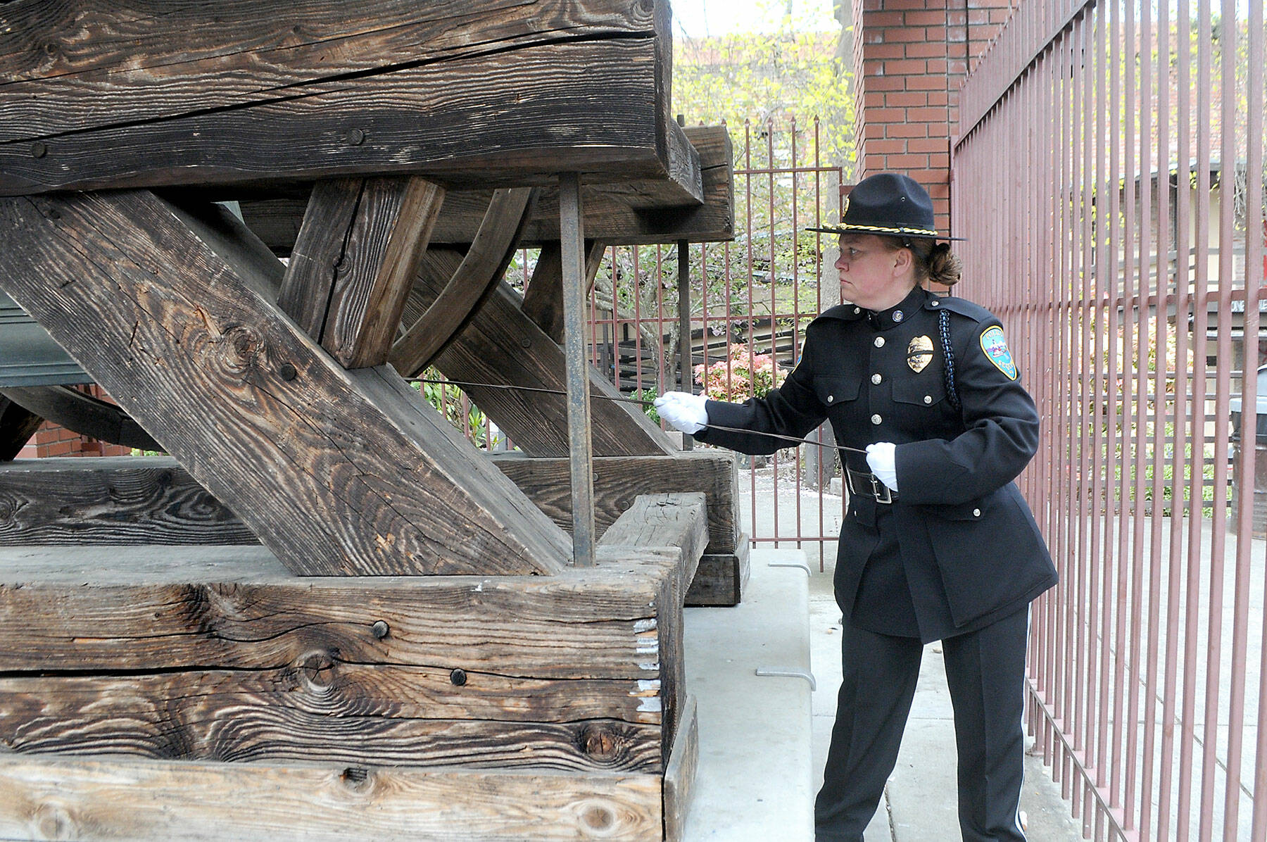 Above: Clallam County Sheriff Bill Benedict, left, reads off the names of Washington law enforcement officers killed in the line of duty as Port Angeles Police Chief Brian Smith looks on during a ceremony of Friday honoring law enforcement personnel as part of National Police Week. The ceremony, held at the Liberty Bell replica at Veterans Park in Port Angeles, included music from the Port Angeles High School choir, a flag ceremony, a gun salute and ringing of the bell.
