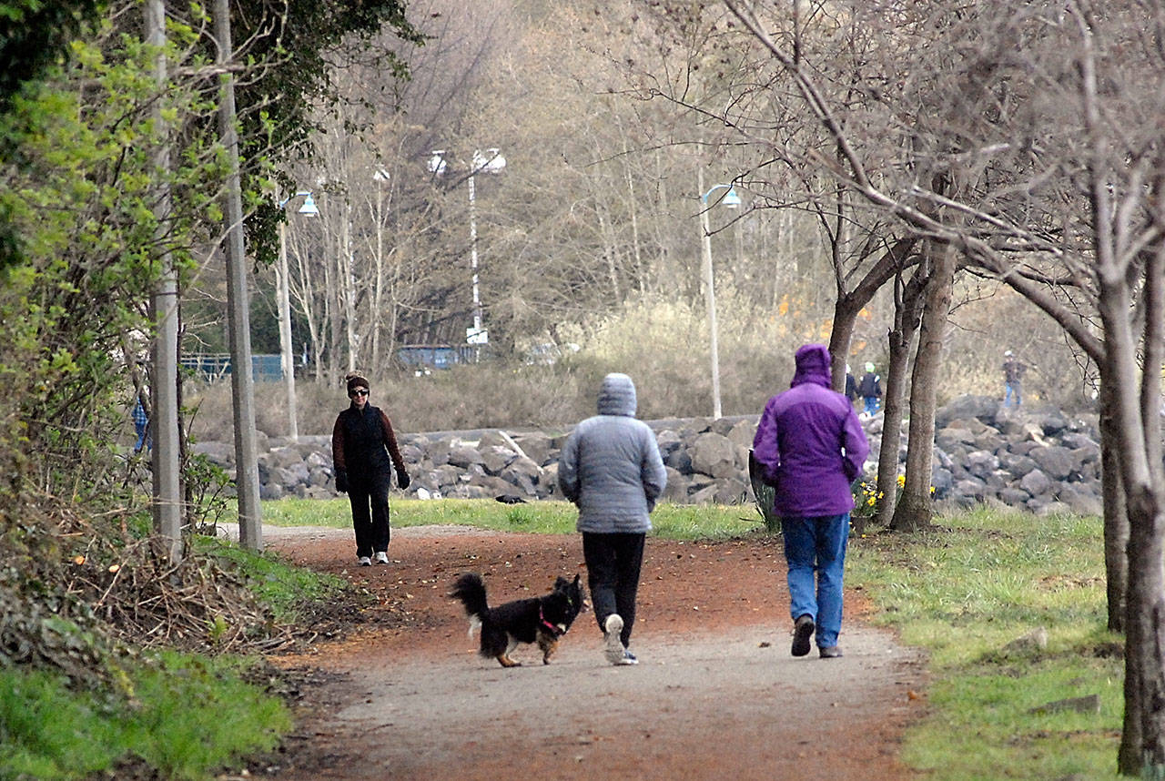 PORT ANGELES — Pedestrians make their way along a stretch of the Waterfront Trail near 9/11 Memorial Park in Port Angeles on Thursday, April 2, 2020.