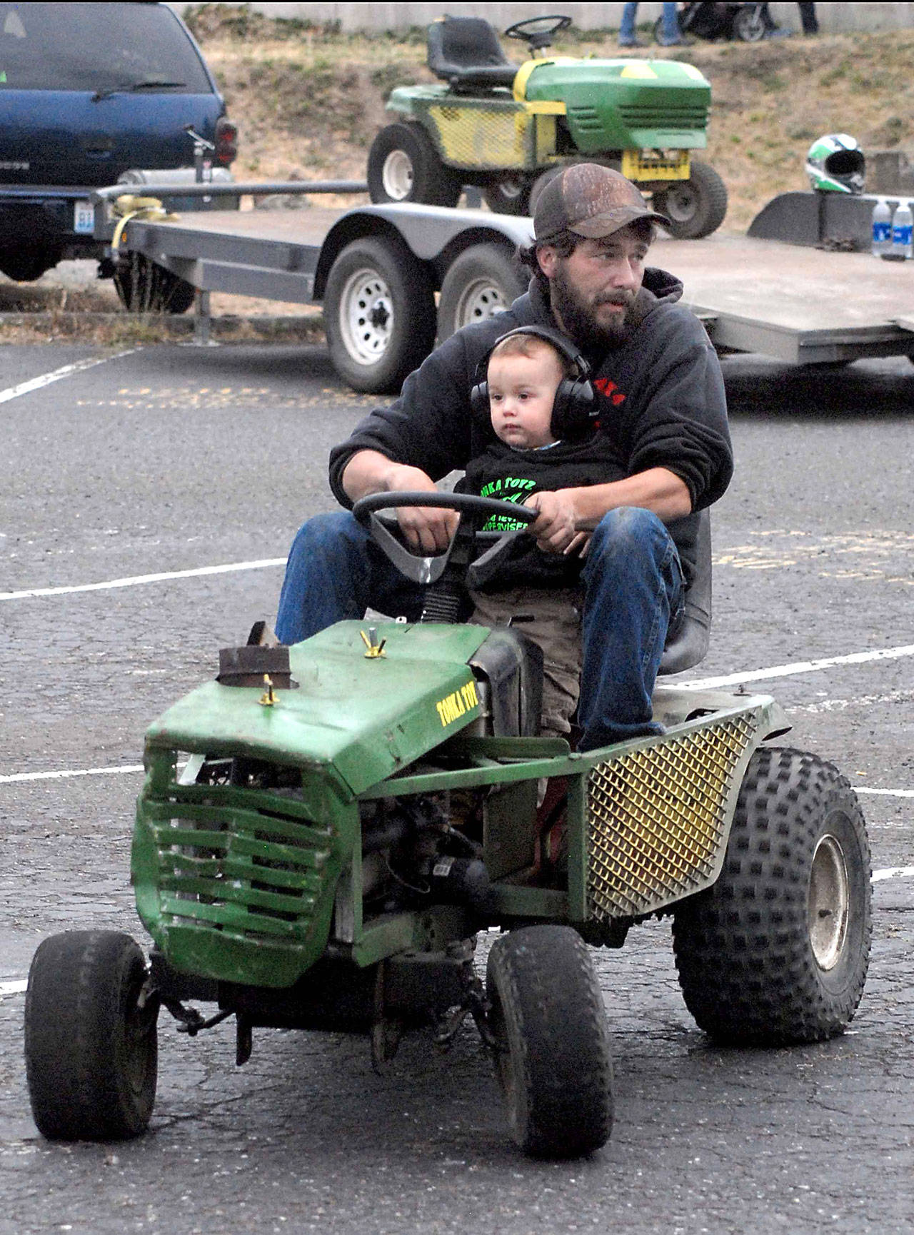 Adam Coile of Port Townsend rides a souped-up lawn mower with his son, Christopher Cole, 1 1/2, during warm-ups for Wednesday’s mower races in Port Angeles. (Keith Thorpe/Peninsula Daily News)