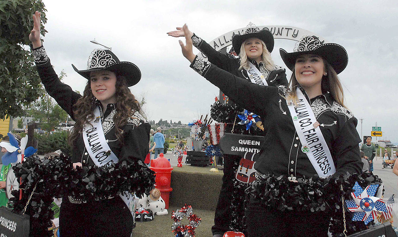 Clallam County Fair royalty princesses Eva O’Neil, left, and Natalie Blankenship, right, along with Queen Samantha Winger, rear, wave from their float in Wednesday’s Independence Day Parade in Port Angeles. (Keith Thorpe/Peninsula Daily News)