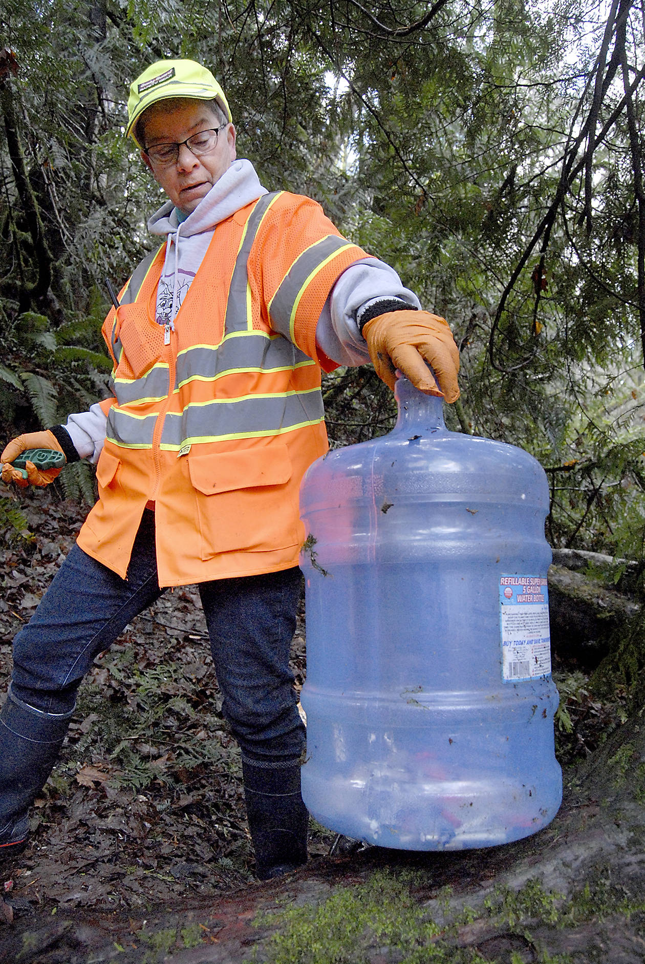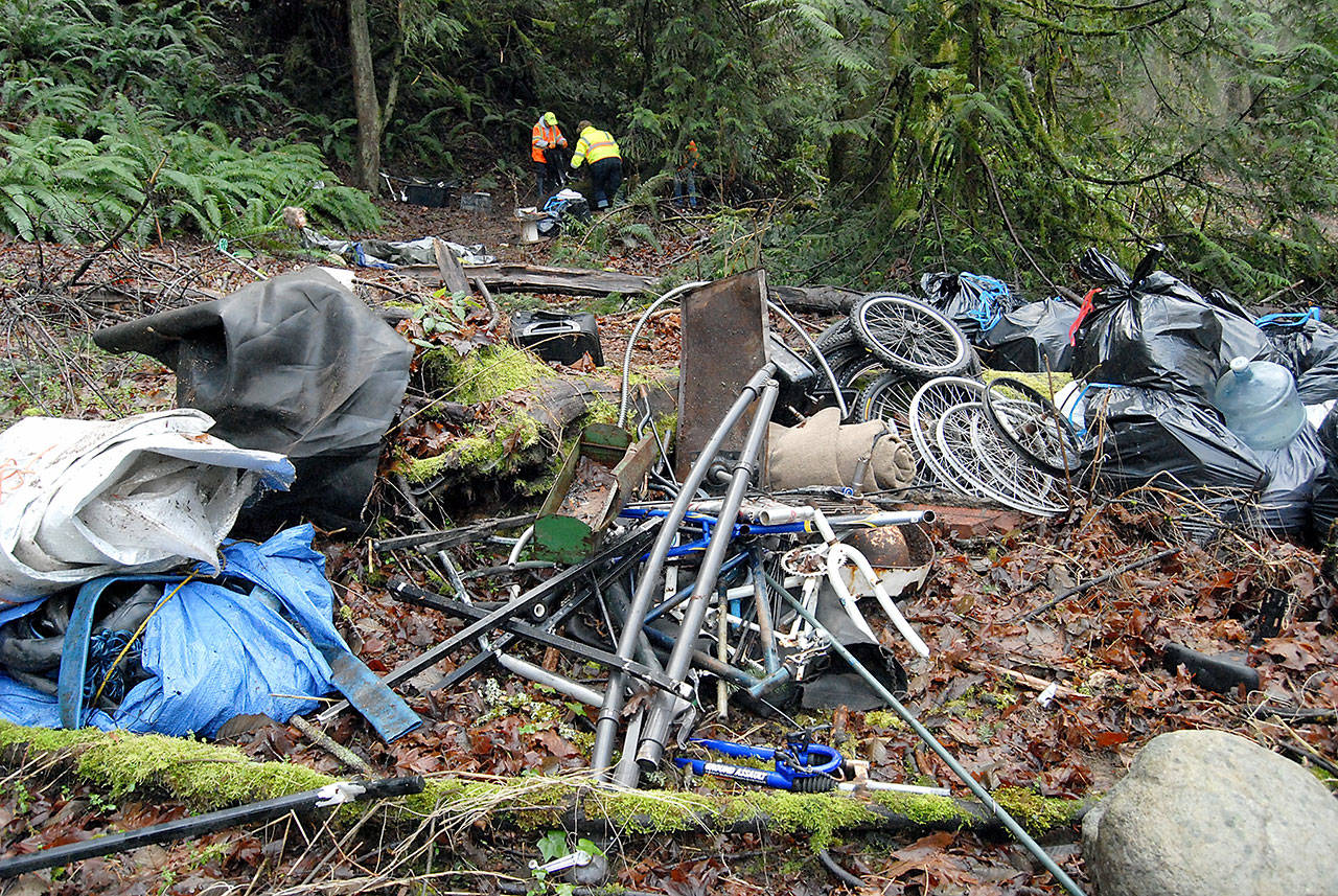 PORT ANGELES — Helping Hands member Bruce O’Rourke drags a tent filled with garbage from a litter-strewn homeless encampment next to Tumwater Creek on Saturday. O’Rourke said this encampment, one of several across greater Port Angeles, contained at least five separate living areas that had sprung up since the area was last cleaned up in August. A collection of cannibalized parts from bicycles lies among bags of refuse collected Saturday at a homeless camp next to Tumwater Creek south of the Eighth Street bridge in Port Angeles. Patty Pastore, a member of the homeless-assistance work group Helping Hands, shows a container of used syringes collected by the group while cleaning up Port Angeles on Saturday, while Amie Woods stands among piles of garbage collected from a single tent site near Tumwater Creek.