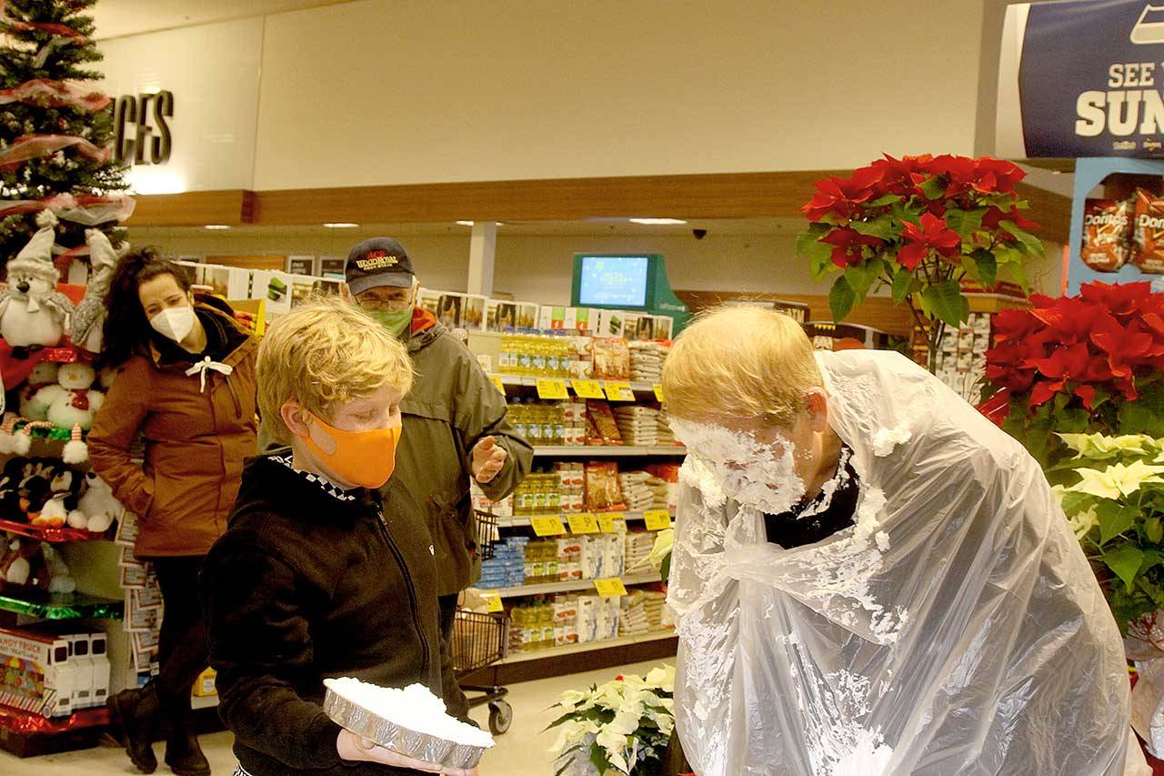 Sequim Mayor William Armacost took a pie in the face Monday in the culmination of a weeklong friendly competition between the Safeway stores in Sequim and on Lincoln Street in Port Angeles.