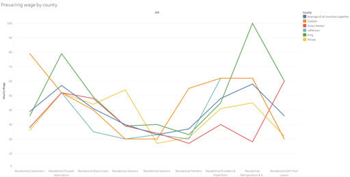 For example, in Clallam County, the going prevailing wage for residential carpenters is $79 an hour. In King County, the prevailing wage is set at $36 an hour.