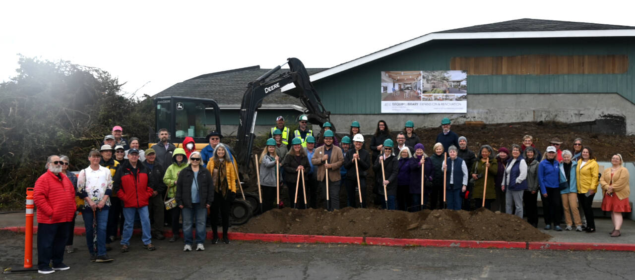 Staff, supporters and partners of the North Olympic Library System planted their shovels into a mound of earth in front of the to-be-renovated library at 630 N. Sequim Ave. on Wednesday, marking the start of a project that will add about 3,800 square feet and myriad amenities to the well-used structure.