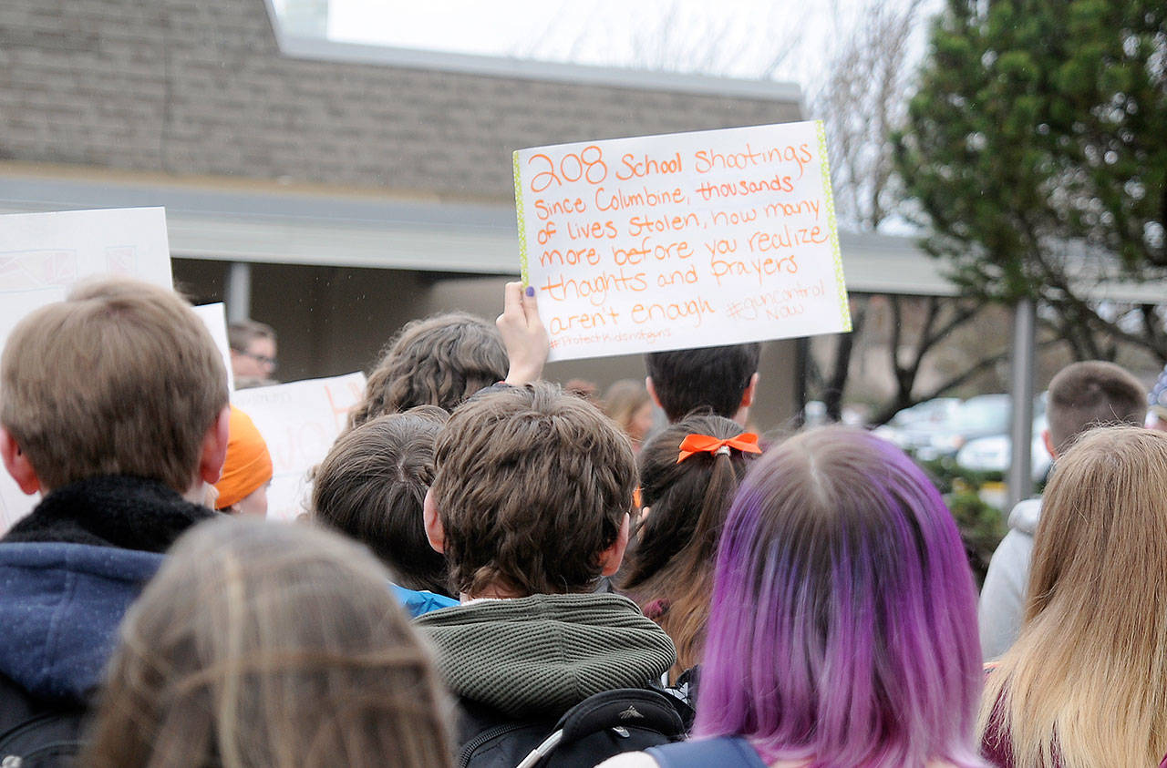 SEQUIM — About 100 students gathered outside the front of Sequim High School for 17 minutes to support the National School Walkout scheduled at 10 a.m. Wednesday morning.