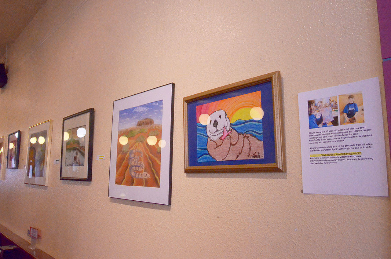 Remy’s art hangs in Elevated Ice Cream, 631 Water St. The exhibit, which went up Saturday for this month’s Port Townsend Gallery Walk, will be on view for the month of April.