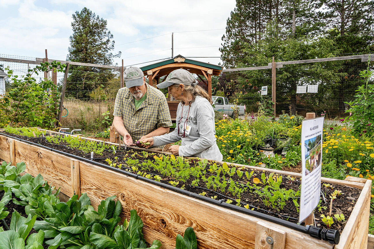 Volunteer Nels Peterson of Port Townsend and Quimper Grange Food Bank Farm co-manager Barbara Tusting pick a few weeds out of the all-access elevated growing bed at the Quimper Grange in Port Townsend on Saturday. The elevated bed is at a height that anyone with limited mobility would not have to bend over to plant or pick the produce. The farm was one of 15 on the 23rd annual Jefferson County Farm Tour. (Steve Mullensky/for Peninsula Daily News)