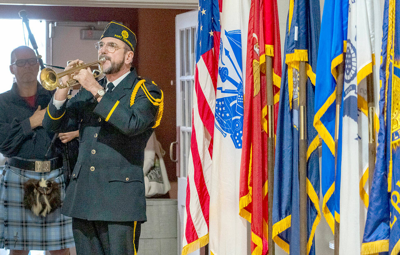 Veterans from each of the armed forces stood as the Port Angeles High School band played their songs: “The Army Song,” “The Marines’ Hymn,” the U.S. Navy’s “Anchors Aweigh” and “The U.S. Air Force Song.” (The U.S. Space Force, established in 2019, was honored, but its song was not played.)