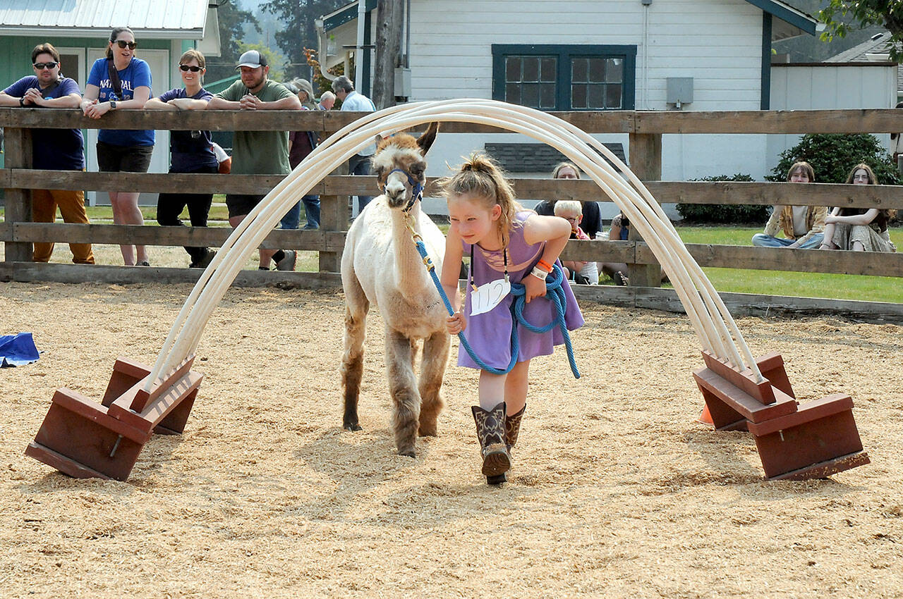Jeff Lee of Vancouver, Wash., controls a pair of draft horses during a power pulling demonstration on Friday in the grandstand arena at the Clallam County Fair.