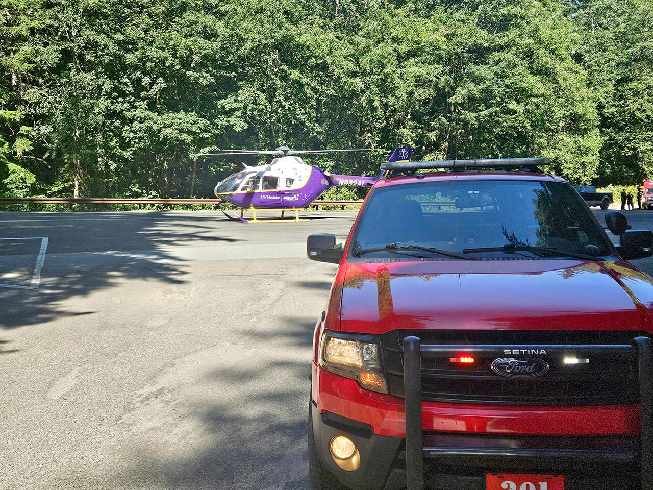 “Clallam 2 Fire-Rescue paramedics and EMTs made contact with the patient and began treatment,” the release stated. “The closest place to land the helicopter was directly on Highway 101 near Sol Duc Road. The highway was closed for about 45 minutes while crews transported the patient, with the Airlift Northwest personnel, from the trail to the awaiting helicopter.”