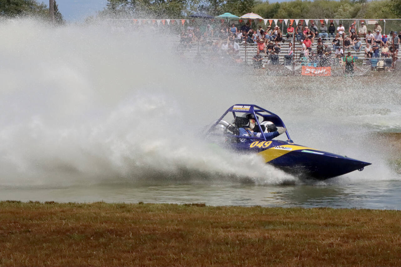 Below, the Obsession No. 49 boat out of Coeur d’Alene, Idaho, competes in the unlimited class of the elimination rounds Sunday at the Extreme Sports Park outside of Port Angeles. A total of 38 boats competed in unlimited, 400 and modified classes in the two-day event. (Photos by Dave Logan/for Peninsula Daily News)