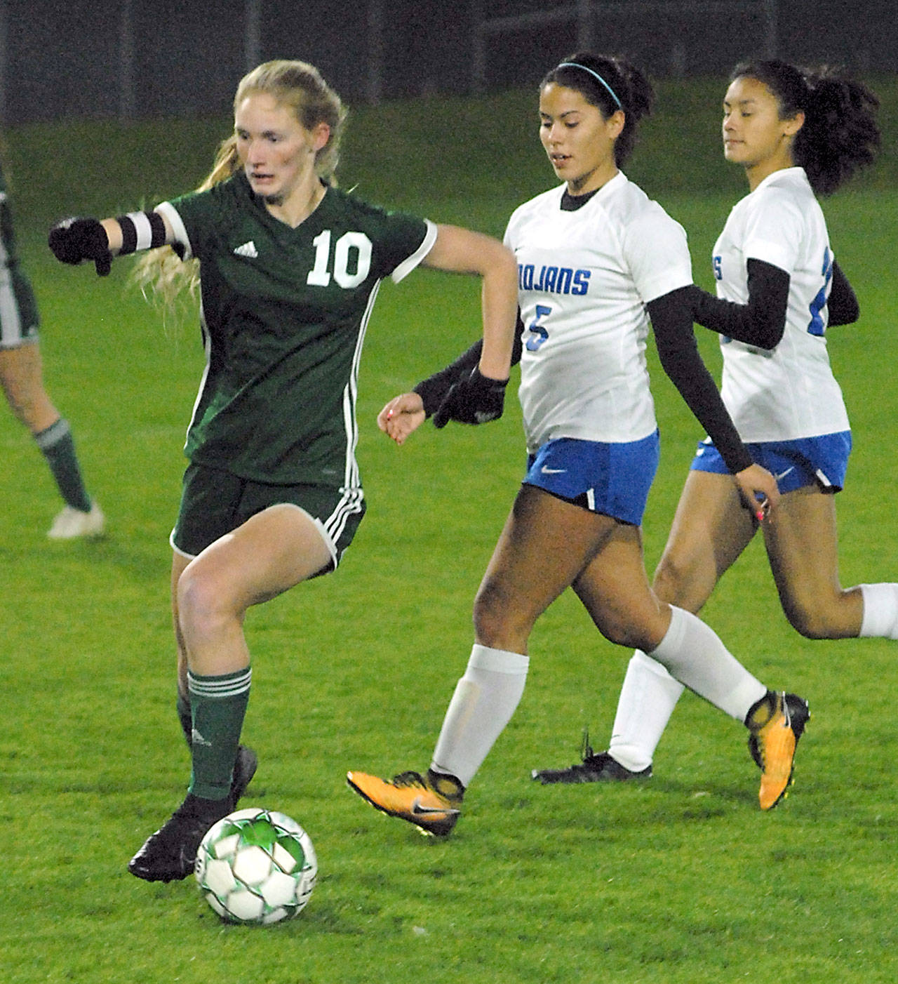 Even with their main striker sidelined while they tried to stop the bleeding, the Riders put a lot of pressure on the Trojans. Bailee Larson had a near-goal on a nice cross and Gagnon missed scoring a goal by perhaps a foot when Port Angeles caught the keeper out of position.