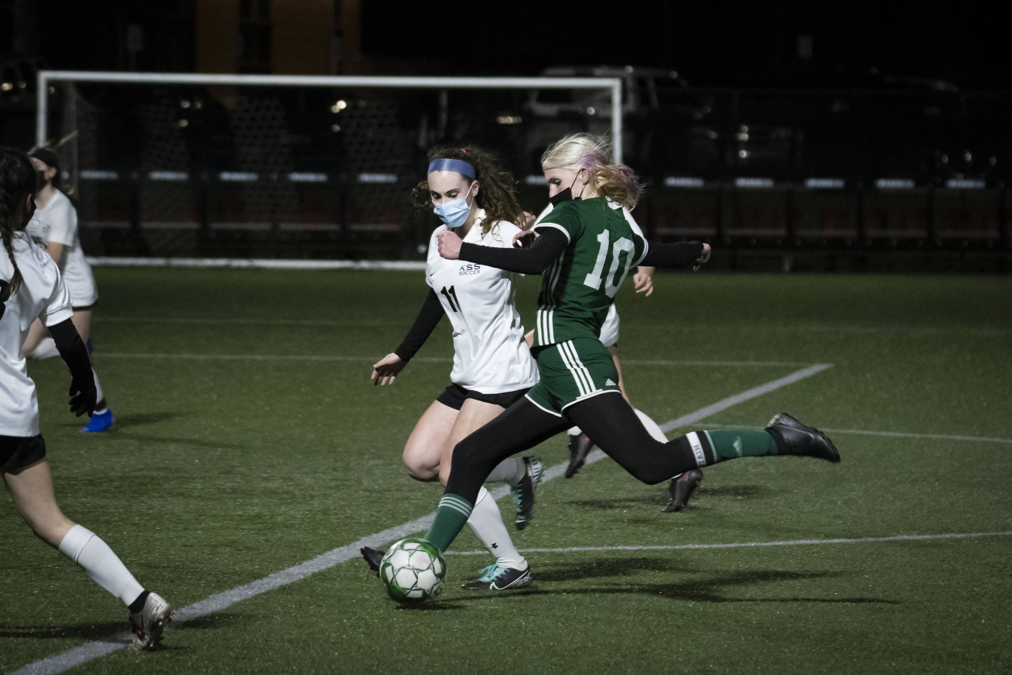 Port Angeles’ Mia Gagnon appeared to have been fouled at the top of the goal box in the 57th minute. The official saw it differently, instead awarding an indirect free kick to the Riders.