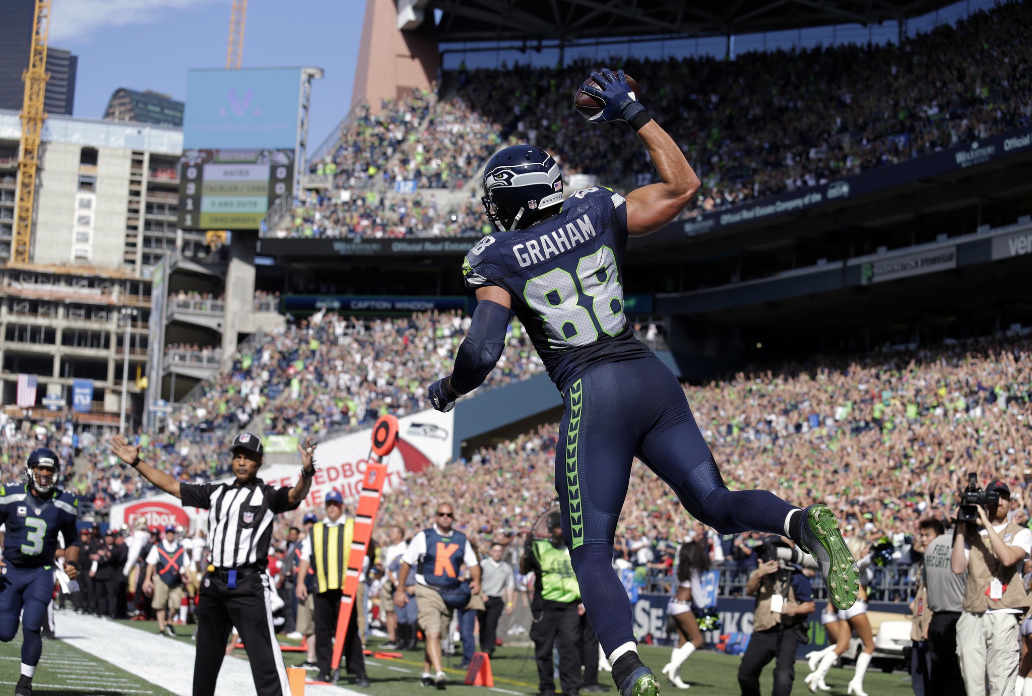 Graham’s score was his first TD since Sept. 27, 2015. He later wrestled a 40-yard jump ball away from safety Eric Reid that set up a field goal. Graham also had an 18-yard catch to convert third-and-15 in the first quarter.