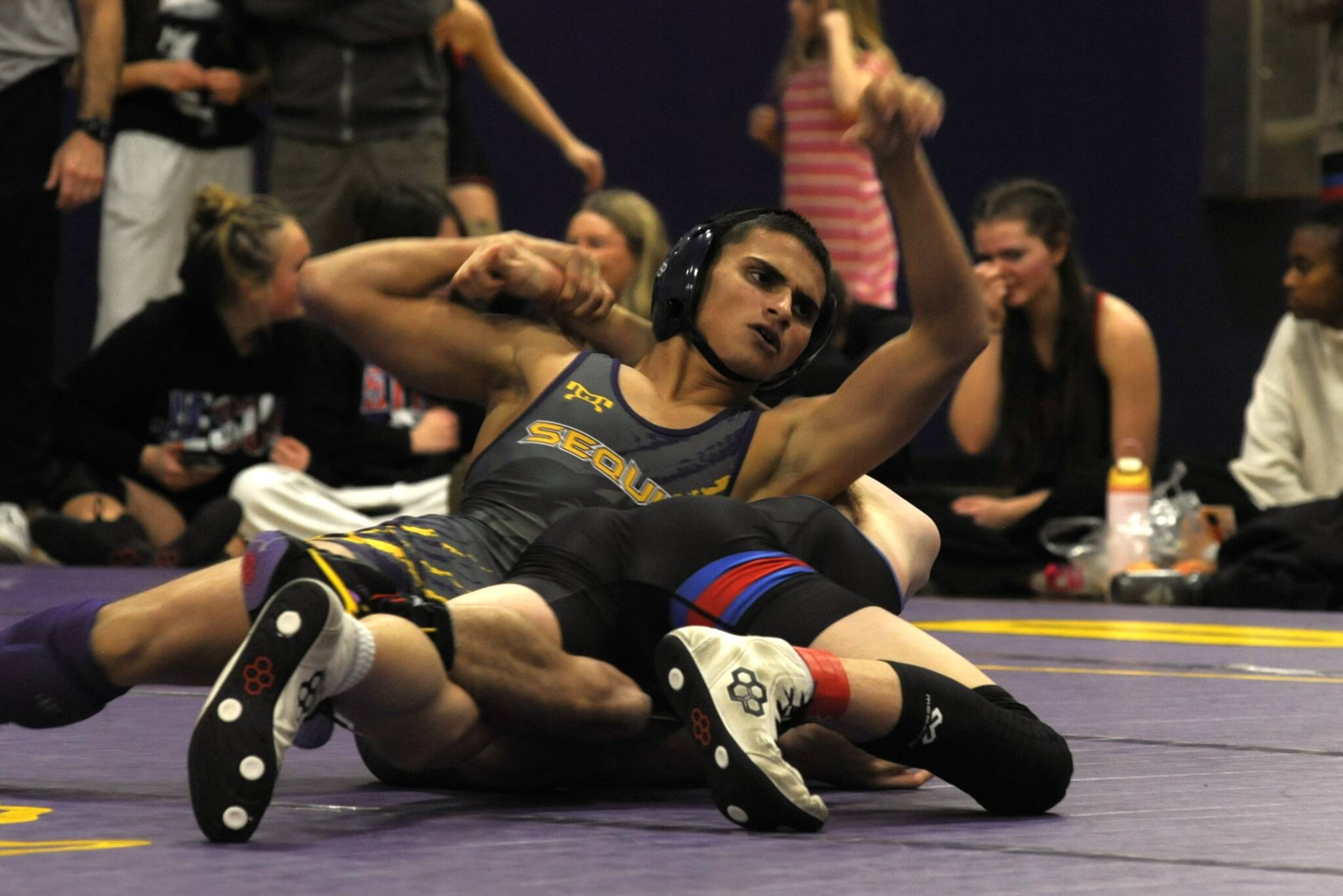 Sequim Gazette file photo by Matthew Nash/ Riley Downs, pictured in a Sequim head-to-head meet earlier this season, will compete at the Mat Classic state 2A meet in the 144-pound bracket.