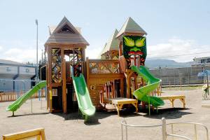 The centerpiece play structure of the Generation II Dream Playground at Erickson Playfield stands over the surrounding play…