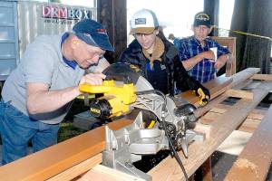 Volunteers, from left, John Albiso, Tien Vo and Bill Chastain cut boards that will become part of the…