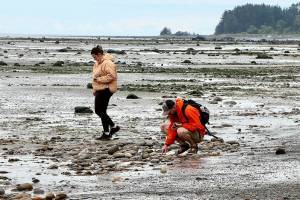 Chris and Linzi Yarwood of Buckley search the low tides over the weekend at Murdock Beach, about five…