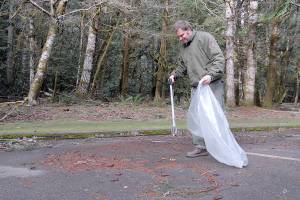 Clay Murdach, a maintenance mechanic with Olympic National Park, picks up trash in the parking lot near the…
