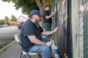 Jesse Adams, front, of Port Townsend, and son Evan of Allyn paint eyes on a section of the…
