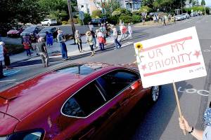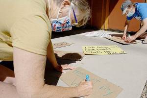 Karen Sturnick of Port Townsend joins about 175 others Tuesday, Aug. 18, 2020, for a rally in support…